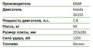 Вибротрамбовка ENAR PH-60H — надежная техника, которая прошла проверку на практике и доказала свою эффективность. Модель имеет следующие характеристики: масса — 64, двигатель — Honda GX100 (мощность двигателя составляет 2.8).