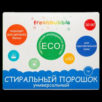 Универсальный стиральный порошок для белья. Подходит для детского белья! Подходит для самой чувствительной кожи! Без аромата! Гипоаллергенно! Натуральный стиральный порошок Freshbubble: - не содержит фосфаты; - не содержит оптические отбеливатели; - не содержит хлор, красители и консерванты. Внутри пачки находится мерный стаканчик.Рекомендации по применению в стиральной машине:При легких загрязнениях - 20 гр.При нормальных загрязнениях - 30 гр.При сильных загрязнениях - 55 гр.При максимальной загрузке стиральной машины : + 30 гр.Ручная стирка: 50 гр на 10 литров воды.Наши экологичные средства для дома созданы из безопасных ингредиентов, с заботой о настоящем и мыслями о будущем. Используя наш натуральный порошок для стирки белья, Вы вносите свой вклад в сохранение нашей планеты здоровой и чистой для будущих поколений. Вода - это самый главный ресурс на планете, сохраним её чистой для наших детей. Создатели марки сами родители и знают, что здоровье наших детей - это самое важное. Наш порошок полностью вымывается из белья, попадая в воду не загрязняет её. Меры предосторожности: хранить в защищенном от детей месте. При попадании в глаза сразу промойте водой. При проглатывании обратитесь к врачу и покажите упаковку. Хранить при температуре от +5° до +25°С. Создано с любовью к людям и природе. При производстве мы используем энергосберегающие технологии без нагрева. Мы за отмену испытаний на животных! За использование цивилизованных методов IN VITRO! Вес: 1 кг. Срок годности: 2 года. Состав: Potassium Carbonate (Сода кальцинированная), Sodium citrate (Цитрат натрия), Sodium Coco-Sulfate (ПАВ на основе кокосового масла), Sodium percarbonate (Перкарбонат натрия), Sodium Chloride (Соль морская), Sodium hydrocarbonate (Сода пищевая), Citric acid (Лимонная кислота), MGDA-Na3 (Биоразлагаемый комплексообразующий агент), Enzyme (Энзим протеазы).Внимание! Фактический цвет изделия может незначительно отличаться от цвета на фотографии в связи с особенностями цветопередачи различных