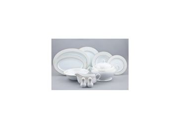 Скромная и утонченная деколь коллекции Эрика не оставит равнодушными любителей неброских рисунков и минималистичных решений. В сервиз входят: 18 - тарелок (6-закусочных, 6-суповых, 6-подставочных); 2 - блюда (большое, малое); 2 предмета для специй (перечница, солонка); 1 - салатник; 1 - супница с крышкой; 1 - соусник. None
