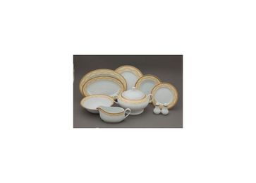 Жизнеутверждающая деколь коллекции Ривьера это несомненный плюс хозяйке при сервировке праздничного стола. Прекрасно сочетающиеся бежевый и золотой на белоснежном фоне украсит любое торжество. В сервиз входят: 18 - тарелок (6-закусочных, 6-суповых, 6-подставочных); 2 - блюда (большое, малое); 2 предмета для специй (перечница, солонка); 1 - салатник; 1 - супница с крышкой; 1 - соусник. None
