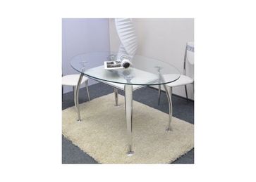 Высота: 75 см. Ширина, глубина : 150 х 90 см. Цвет ножек - хром, кож. зам. белый Столешница - прозрачная, полка - белая Форма столешницы - овальная, полка - квадратная None