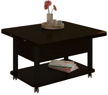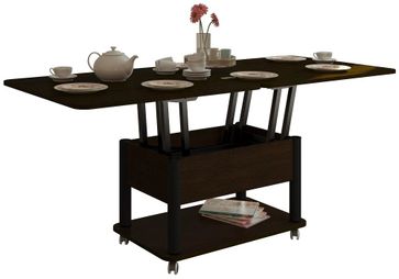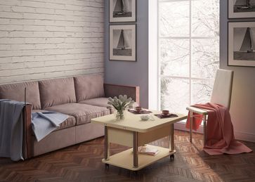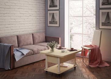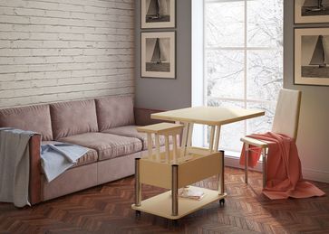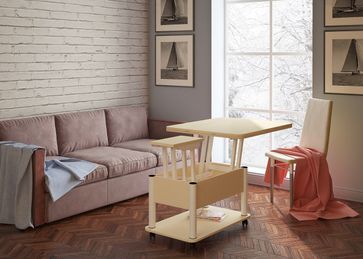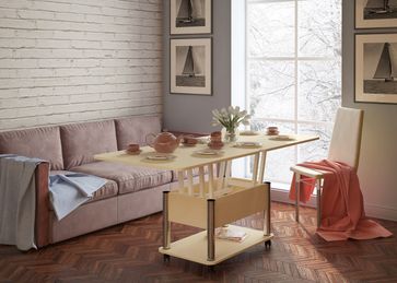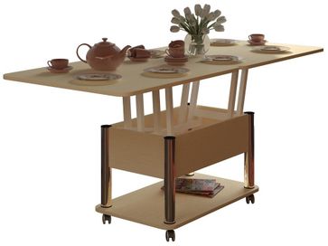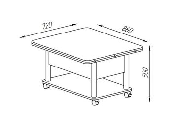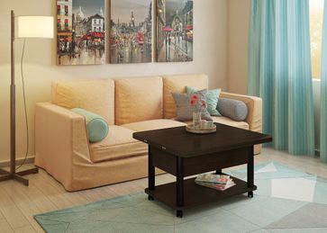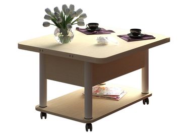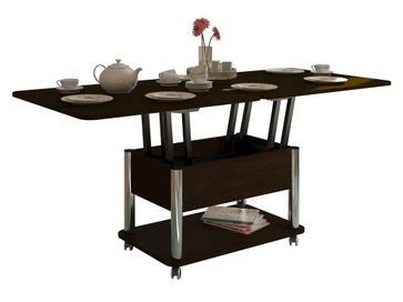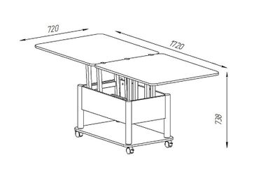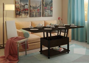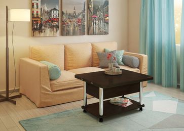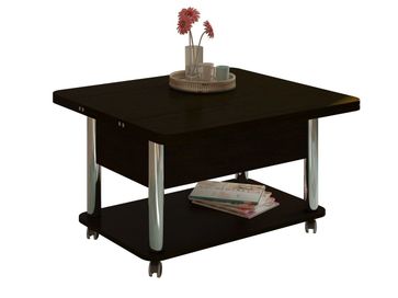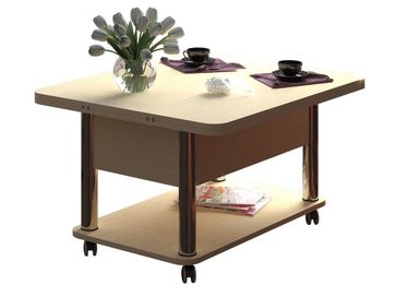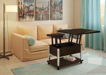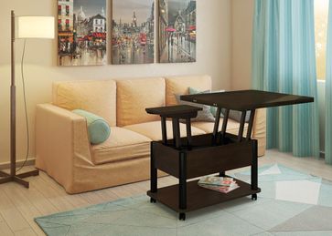 Преимущества: <br> трансформер — журнальный стол легко и быстро превращается в обеденный стол;<br> мобильный — колесики позволяют легко передвигать стол по дому, а благодаря блокировки колес, стол можно зафиксировать в любом месте;<br> долговечный — сочетание прочной столешницы, крепких ножек и надежного механизма позволит столу прослужить вам долгое время.<br>