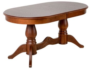 Солидный образ обеденного раздвижного стола Рифей покоряет с первого взгляда. Массивные опоры в сочетании с фактурой натурального дерева выглядят гармонично и притягательно. На детали опор нанесены фрезерованные рисунки в растительных мотивах. Рисунок на соединительной перекладине венчает стилизованный цветок лилии, который во всех культурах является символом с позитивным значением.<br>