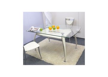 Высота: 75 см.Ширина, глубина : 150 х 90 см.Цвет ножек - хром, белый кож. зам.Столешница - прозрачная, полка - белый кож. зам.Форма столешницы - прямоугольная, полка - прямоугольная None