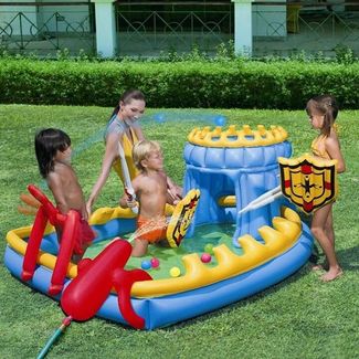 Надувной детский игровой центр-бассейн. Сделан в виде крепости с надувной башней. Игровой центр изготовлен из прочного винила, встроенный предохранительный клапан защищает от избыточной нагрузки. В комплекте надувная пушка, которую можно подключить к садовому шлангу и надувная катапульта, стреляющая шариками. Так же в комплект входит 2 надувных меча, 2 щита, 6 пластиковых шариков.Насос в комплект не входит. Для детей от 3-х лет. Объем (при 75% заполнении) 300 л. Размер: 249 x 155 x 79 см Минимальная сумма заказа 500 руб.