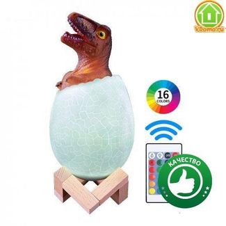 Страна-изготовитель: КитайСпособствует релаксации и помогает быстрее погрузиться в сон! Ночник - Динозавр с пультом Такой аксессуар точно вызовет восторг у вашего сына. Когда вы начнете им пользоваться, то обязательно отметите широкий спектр цветов свечения (16 цветов). А чтобы поменять цвет, нужно просто дотронуться до скорлупы яйца. Комплектация Ночник; USB кабель; Деревянная подставка; Пульт дистанционного управления. Технические характеристики Материал: ПВХ; Мощность: 0,5 W; Емкость аккумулятора: 300-500 мАч; Время зарядки: 2-3 часа; Время работы: до 20 часов (в зависимости от выбранной яркости).
