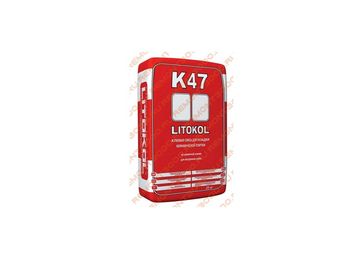 Клеевая смесь на цементной основе для укладки керамической плитки на пол и стены. Для внутренних работ. LITOKOL K47 - порошкообразный клей на основе серого портландцемента с добавлением эфиров целлюлозы. В качестве наполнителя используются кварцевые пески с отсортированным размером гранул.