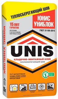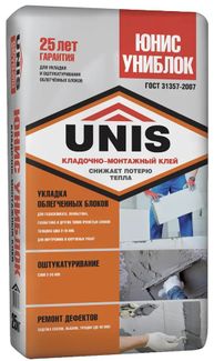 - ЮНИС Униблок клей монтажный для ячеистого бетона (25кг) UNIS Униблок цементный кладочно-монтажный клей для легких блоков (25кг) по выгодной цене 192 р. руб.;