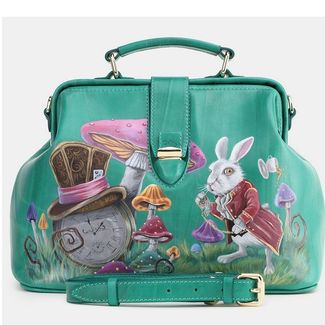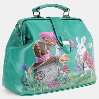 Женская сумка саквояж из натуральной зеленой кожи «Алиса»:одно отделениевнутри два кармана для мелких предметовдлинный ремень через плечокороткая ручка Сумка «Алиса» из коллекции Алиса в стране чудес бренда Alexander TS - настоящее произведение искусства. Картинка на сумке создана художником при помощи специальной техники выжигания по коже и росписи красками. Каждый рисунок наносится на кожу вручную, что обеспечивает его неповторимость. В нашем магазине можно купить как готовую сумку, так и заказать сумку индивидуально. При одновременном заказе комплекта аксессуаров, например портмоне + сумка, предполагается дополнительная скидка. None Возможен самовывоз. Есть доставка.