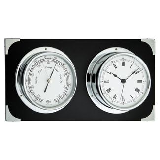 Барометр и кварцевые часы, установлены на черной лакированной панели размером 300 x 150 мм.