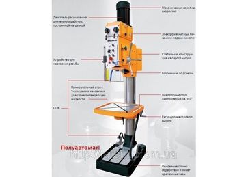 Cверлильный станок Drilling 45Е предназначен для сверления, расточки и развертки отверстий в различных материалах.Сверлильный станок FDB Maschinen Drilling 45Е Особенности: Шпиндели установлены в шарикоподшипники и оснащены конусом Морзе МK 2, МK 3 или МК 4, на который можно надеть сверлильный патрон или непосредственно режущий инструмент. Можно производить поворот рабочего стола на 360° при помощи поворотной цапфы, а также его наклон до +/– 45 по отношению к основной плоскости, что позволяет высверливать отверстия под различными углами. Технические характеристики: Мощность мотора 380 В / 1500 В Предельный диаметр сверления o 45 мм Диаметр нарезки резьбы (сталь железо) М 20 и М 24 Ход шпинделя 180 мм Конус шпинделя МТ 4 Диапазон подачи 2 шага / 0.1 — 0.2 мм/об. Диаметр колонны o 92 мм Скорость шпинделя 50 — 1450 об/мин Ширина гнезда для Т-образной головки болта 180 мм Максимальное расстояние между: осью шпинделя и колонной 350 мм между концом шпинделя и поверхностью стола 770 мм между концом шпинделя и поверхностью основы 1320 мм Вес нетто/брутто 595 / 640 кг None Возможен самовывоз. Есть доставка.