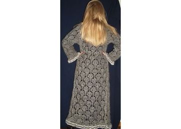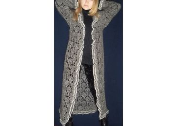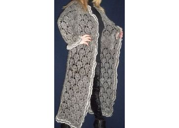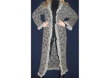 Шикарный кардиган удлиненный выполненный крючком из натурального оренбургского пуха. Размер 44. Края кардигана обработаны ажурными воланами с белой окантовкой, что придает изделию необычайную оригинальность. Можно носить под пояс. Ручная работа. Цвет серый. Мягкий и тёплый. При заказе указывайте нужный Вам размер и длину изделия. Срок изготовления до 2 недель.