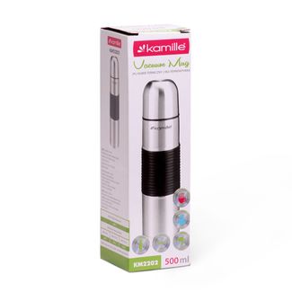Термос Kamille обладает высоким качеством, надежностью, компактными размерами и эстетичным дизайном. Такой термос станет незаменимым в машине, на отдыхе или в путешествии. Материал корпуса: нержавеющая сталь. Резиновая вставка: есть. Материал колбы: нержавеющая сталь. Материал крышки: нержавеющая сталь. Объем: 500мл. Ручка: нет. Время сохранения температуры: 6-8 часов. .Особенности: