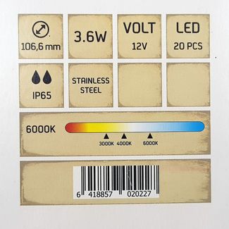 С 20 x 0,2 Вт светодиодами, теплый белый свет. Ø 106,6 мм. Из нержавеющей стали AISI 304. Водонепроницаемость IP65. Требуется предоплата от 100% Страна производства: Финляндия Возможен самовывоз. Есть доставка. Доставка: 350.0RUB