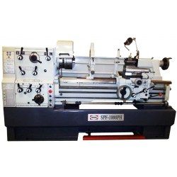 Универсальный токарный станок SPF-1000PHS предназначен для обработки тел вращения путём снятия с них стружки при обточке. На станке можно выполнять различные виды токарной обработки: обтачивание цилиндрических, конических, фасонных поверхностей, подрезку торцов, отрезку, растачивание, а также сверление и развёртывание отверстий, нарезание резьбы и накатку рифлений, притирку и т.п. Модель оснащена ножным тормозом, лампой рабочего освещения и системой охлаждения СОЖ. Данный станок широко используется в условиях серийного и мелкосерийного производства, в ремонтных цехах, в слесарных и столярных мастерских, на складах и т.п.Основные узлы и детали оборудования Рукоятка перемены скорости главного шпинделя Рукоятка перемены высокой/низкой скорости Рукоятка перемены скорости главного шпинделя Рукоятка хода влево/вправо Рукоятка выбора подачи резьбы Рукоятка перемены подачи резьбы Диск перемены 10 шагов подачи Выключатель электропитания Прерывающий переключатель Переключатель охлаждающего насоса Кнопка управления запуском шпинделя Эксцентриковое центрирующее кольцо Маховик продольного движения фартука Кнопка подачи поперечных салазок Центрирование с автоматической остановкой Рукоятка автоматической подачи Педаль ножного тормоза Рукоятка маточной гайки Рукоятка выбора подачи (Продольной и поперечной) Винты крепления суппорта Болты регулировки фундамента Рукоятка «Пуск» 4-позиционная рукоятка автоматической остановки Ходовой винт Тяга автоматической подачи Винты регулировки центрирования задней бабки Корпус задней бабки Маховик задней бабки За
