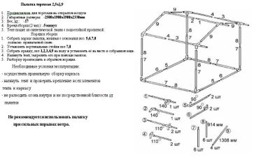 Вес: 17 кг. Размеры: 2.5 х 1.9 м, длина козырька 30 см. Особенности: в задней стенке имеется дверь на молнии.Инструкция к торговой палатке 2,5х1,9 м None