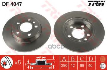 Диск Тормозной | Зад | Vw Transporter Iv Platform Chassis (70e, 70l, 70m, 7de, 7dl, 7d 2.4 D 09.1990 - 04.1998 <=> Vw Transporter Iv Box (70a, 70h, 7da, 7dh) 1.9 Td 10.1992 - 04.2003 TRW арт. DF4047