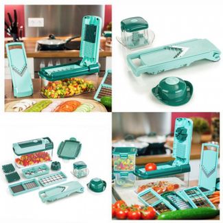 Съемная крышка; Контейнер; Прибор для очистки шелухи; Большая терка; Нарезка для квадратной формы; Нарезка для мелких кубиков; Насадка для нарезания дольками; Съемная насадка-чехол на лезвие.