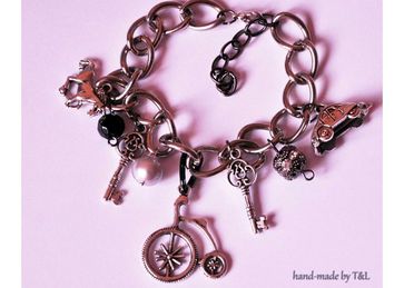 Концептуальный браслет ручной сборки. отображена история развития транспорта подвески: лошадь, велосипед, ретро-автомобиль). браслет также дополнен декором в виде бусинки из натурального жемчуга и другими элементами. None Есть доставка.