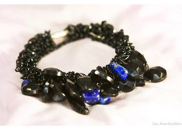 Браслет ручной работы с лазуритами и черными стеклянными бусинами-каплями. фурнитура черного цвета. диаметр 19 см, с цепочкой для уменьшения обхвата. браслет идет в фирменной коробке ручной работы. None Есть доставка.