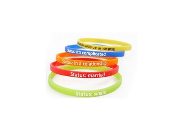 в комплект входит пять браслетов разных цветов с надписями. красный - "status: married", оранжевый - "status: in a relationship", синий - "status: its complicated", зеленый - "status: single" и желтый - "status: in an open relationship".