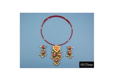 Яркий винтажный комплект из индии, 70-е годы из колье и серег. колье облегает шейку, а крупный кулон расставляет акценты. кулон двусторонний с красивейшими яркими эмалями, стразами и подвесками: одна сторона в форме красных сердец, другая сторона с сочной зеленой светящейся эмалью. очень красивая работа. украшение хоть и яркое, но не навязчивое. размер колье охват шеи) может регулироваться и растягиваться. реально красивый комплект. размер кулона 4x6,2 см. серьги вторят в такт колье: только не такие массивные, как кулон. размер серьги 1,5x4,4 см, миниатюрные и аккуратные, отлично дополняют колье, можно носить их отдельно. состояние отличное винтажное. None Есть доставка.