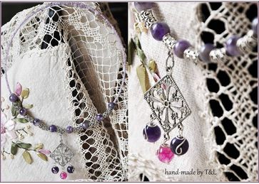 Комплект в винтажной фурнитуре - колье и серьги.ручная работа. камни - тонированный агат, аметист. фурнитура у серег - серебро 925 пр. None Есть доставка.