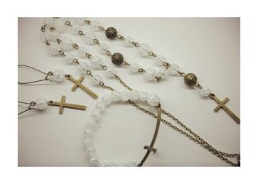 Фурнитура цвет бронза, камни - горный хрусталь кракле 8 и 10 мм., браслет с крестом на резинке, колье длинна до груди, серьги на длинных швензах. None Есть доставка.