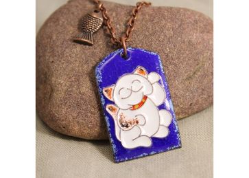 Кулон с трёхцветной кошкой манэки нэко на синем фоне. кошка манэки нэко с поднятой левой лапкой привлекает покупателей или нужные связи. медная рыбка символизирует жизненные силы и здоровье. высота кулона около 3,5 см ширина около 2 см, длина цепочки 50 см. горячая эмаль на меди. авторская работа. фурнитура фабричная из сплава с покрытием медного цвета и медная ручной работы. None Есть доставка.