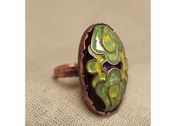 Перстень из меди со вставкой с горячей перегородчатой эмалью. украшен орнаментом по мотивам традиционных русских изделий с горячей эмалью. ворга — по словарю даля, болотистая, кустарная лощина. зелёный узор на глухом чёрном фоне, напоминает островки зелени среди тёмной воды топи. перстень крупный, оправа ручной работы из чернёной меди. декоративная часть перстня 28х17мм , 18 размер горячая эмаль на меди. авторская работа. фурнитура фабричная из сплава с покрытием медного цвета и медная ручной рабо None Есть доставка.