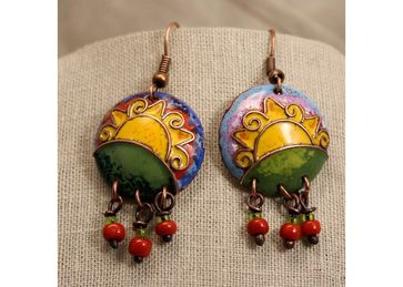 На серёжках солнце всходит и заходит. то есть одна изображает — закат, другая — рассвет. диаметр декоративной части серёжек — 2см., горячая эмаль на меди. авторская работа. фурнитура фабричная из сплава с покрытием медного цвет None Есть доставка.
