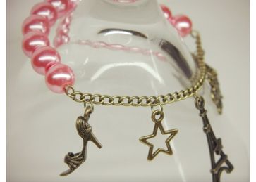 Браслет на руку, на резинке, использованы материалы - бусины 8 мм стекло, под жемчуг, цвет розовый, фурнитура цвет бронза подвески, цепь) None Есть доставка.