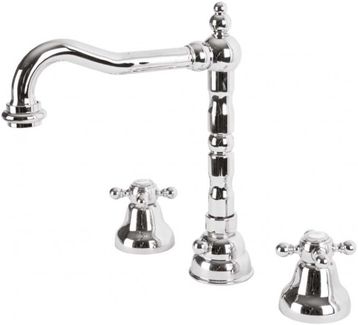 Управление: вентильное Материал: латунь Исполнение: хром, бронза, золото 24 карат Длина излива: 18 см Механизм: керамическая кран-букса Отверстия для монтажа: 3 отверстия Тип подводки: гибкая 1/2" Оснащение: донный клапан, аэратор Дополнительная информация: поворотный излив