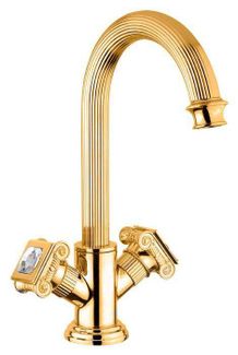 Управление: вентильное Материал: латунь Исполнение: хром, бронза, золото 24 карат Длина излива: 15,5 см Механизм: керамическая кран-букса Отверстия для монтажа: 1 отверстие Тип подводки: гибкая 1/2" Оснащение: донный клапан, аэратор Рабочий интервал давления в водопроводной сети: 0,5-6,0 Атм Гарантия: 5 лет с даты продажи (за исключением резиновых уплотнителей, шлангов, переключателей)