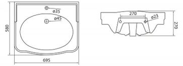 •Габаритные размеры чаши раковины: 695x580x270 •Габаритные размеры пьедестала: 325x333x625 •Отверстие под смеситель: 1 отверстие • Гарантия на сантехнический фаянс в отношении дефектов изготовления и материалов (за исключением сидений, резинотехнических изделий) - 25 лет с даты продажи - на резинотехнические изделия - 1 год с даты продажи None