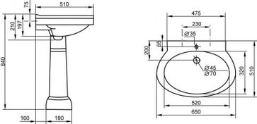 •Габаритные размеры раковины с пьедесталом: 520х610х840 •Отверстие под смеситель: 1 отверстие •Гарантия 25 лет на фаянс None