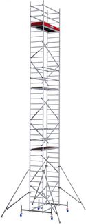 максимальная рабочая высота 12,30 м (для наружных работ максимум 10 м по EN 1004); высоту установки площадки с люком (2,00 х 0,6 м) можно изменять от перекладины к перекладине (с интервалом 25 см); проверены TV/GS, допустимая нагрузка 200 кг/м2 по EN 1004; погодостойкий противоскользящий настил из панели пропитанной фенольной смолой; быстрая сборка без инструмента благодаря страховочным зажимам с силовым соединением посредством выдвигаемой скобы на перекладине; ролики с тормозом регулируемые по высоте для установки вышки на неровной поверхности; легко монтируемые угловые подпоры обеспечивают дополнительную устойчивость вышек с рабочей высотой 7,30 м и более; конструкцию в собранном состоянии можно легко двигать по базовой траверсе; противоскользящие профилированные перекладины на вертикальных рамах образуют надежную лестницу для подъема с внутренней стороны; оптимальная устойчивость благодаря высокопрочным базовым траверсам.