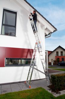 Алюминиевая трехсекционная лестница TRIBILO с перекладинами 3х9 перекладин, универсального применения: может использоваться как приставная и выдвижная лестница или как стремянка.