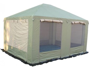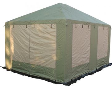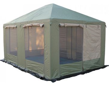 В этом шатре площадью 12 кв. м. комфортно разместится 13 человек.Беседка предназначена для коллективного отдыха на природе и может использоваться в виде летней кухни.Тент пошит из полиэфирной ткани с водоотталкивающей пропиткой, устойчивой к воздействию солнечных лучей. Швы крыши проклеены. Широкая замкнутая юбка полностью исключает поддув холодного воздуха снаружи, затекания воды, проникновение змей, грызунов и пр.. В верхней части крыши встроен 2 вентиляционных закрывающихся изнутри клапана, снабженный антимоскитной сеткой от насекомых и защитным козырьком от осадков.В длинных противоположных боковых стенах имеются 4 окна из прозрачной пленки, закрывающиеся шторками на молниях.Тент крепится к каркасу при помощи стропы с пряжкой и липучек. Это позволяет осуществить хорошую натяжку тента, что очень важно при ветре и дожде.Все стенки с москитной сеткой и шторками сверху пришиты к тенту и крепятся к ножкам при помощи застежек-молний. При необходимости все стенки могут подниматься.Тент имеет прочные петли-оттяжки для повышения ветроустойчивости.Каркас беседки изготовлен из стальной трубы Ø 25 и 28 мм, имеет нижнее основание и покрыт порошковой краской. Нижнее основание и верхняя обвязка служат для повышения прочности конструкции. Для фиксации элементов каркаса между собой используются кнопки-защёлки. Соединительные элементы (крестовины) выполнены из стальной трубы увеличенной толщины.В комплект шатра входит:— каркас;— крыша с ножками;— сплошные стенки (2 шт.);— стенки с окнами (4 шт.)— стенки из антимоскитной сетки (6 шт.)Не забудьте купить комплект колышков, чтобы хорошо растянуть Ваш шатер и сделать его еще более крепким и ветроустойчивым. None