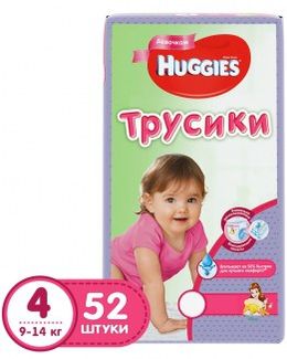 - Huggies 4 (9-14 кг) для девочек 52 шт по выгодной цене 1 230 р. руб.;