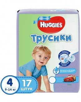 - Huggies 4 (9-14 кг) для мальчиков 17 шт по выгодной цене 421 р. руб.;