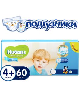- Huggies Huggies Ultra Comfort 4+ (10-16 кг) для мальчика 60 шт по выгодной цене 1 339 р. руб.;