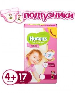 - Huggies Ultra Comfort 4+ (10-16 кг) для девочек 17 шт по выгодной цене 321 р. руб.;