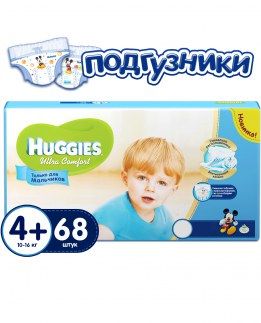 - Huggies Ultra Comfort 4+ (10-16 кг) для мальчиков 68 шт по выгодной цене 1 520 р. руб.;