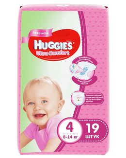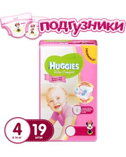 - Huggies Ultra Comfort 4 (8-14 кг) для девочек 19 шт по выгодной цене 400 р. руб.;