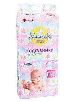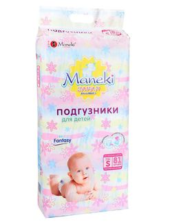 Подгузники Maneki Fantasy S 4-8 кг в упаковке 81 шт. Отлично впитывают влагу и не протекают. В области талии - эластичный пояс, манжеты - мягкие резинки. Минимальная сумма заказа 1500 руб. Возможен самовывоз. Есть доставка.