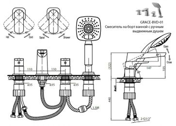 Смеситель на борт ванны с ручным выдвижным душем CEZARES GRACE-C-BVD GRACE-C-BVD-01