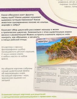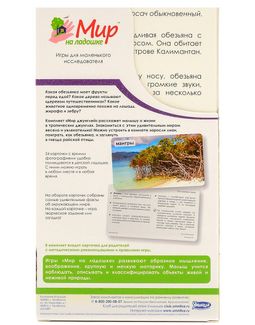 Развивающие карточки Умница Мир на ладошке-3 Мир джунглей - набор, состоящий из 24 ярких карточек с изображениями тропических растений и животных. На обратной стороне каждой из карт комплекта родители найдут интересную информацию и занимательные задания, которые позволят расширить кругозор ребенка, подарив ему новые знания о жителях планеты. Изучение красочных картинок развивает внимание, логическое и образное мышление, словарный запас и память малыша. Для родителей, которые только знакомятся с набором, предусмотрена карточка с небольшой инструкцией. Минимальная сумма заказа 1500 руб. Возможен самовывоз. Есть доставка.