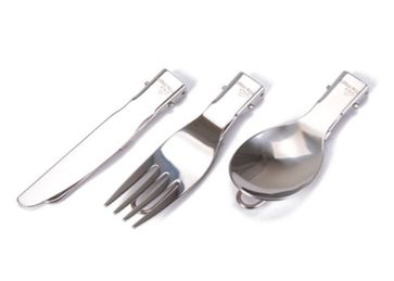 Очень компактный набор из ножа, вилки и ложки. Пригодится в походе и сэкономит много места, благодаря тому, что все приборы складываются. В комплекте чехол фирменного оранжевого цвета. None