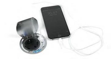 Блок электрических розеток с наполнением: 1 розетка 220В и 1 USB зарядка (1 ампер), LED подсветка, диаметр отверстия для врезки - 70 мм, длина силового кабеля -1 метр. Цвет анодированный алюминий. None